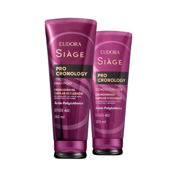 Recupere a saúde e a beleza dos cabelos com o Combo Siàge Pro Cronology, que traz o Shampoo e o Condicionador Eudora Siàge Pro Cronology para um tratamento completo. Desenvolvido para higienizar, proteger e reparar, este kit ajuda a pausar a degradação e o desgaste dos fios, recuperando até os danos mais severos em apenas 2 semanas de cuidados.